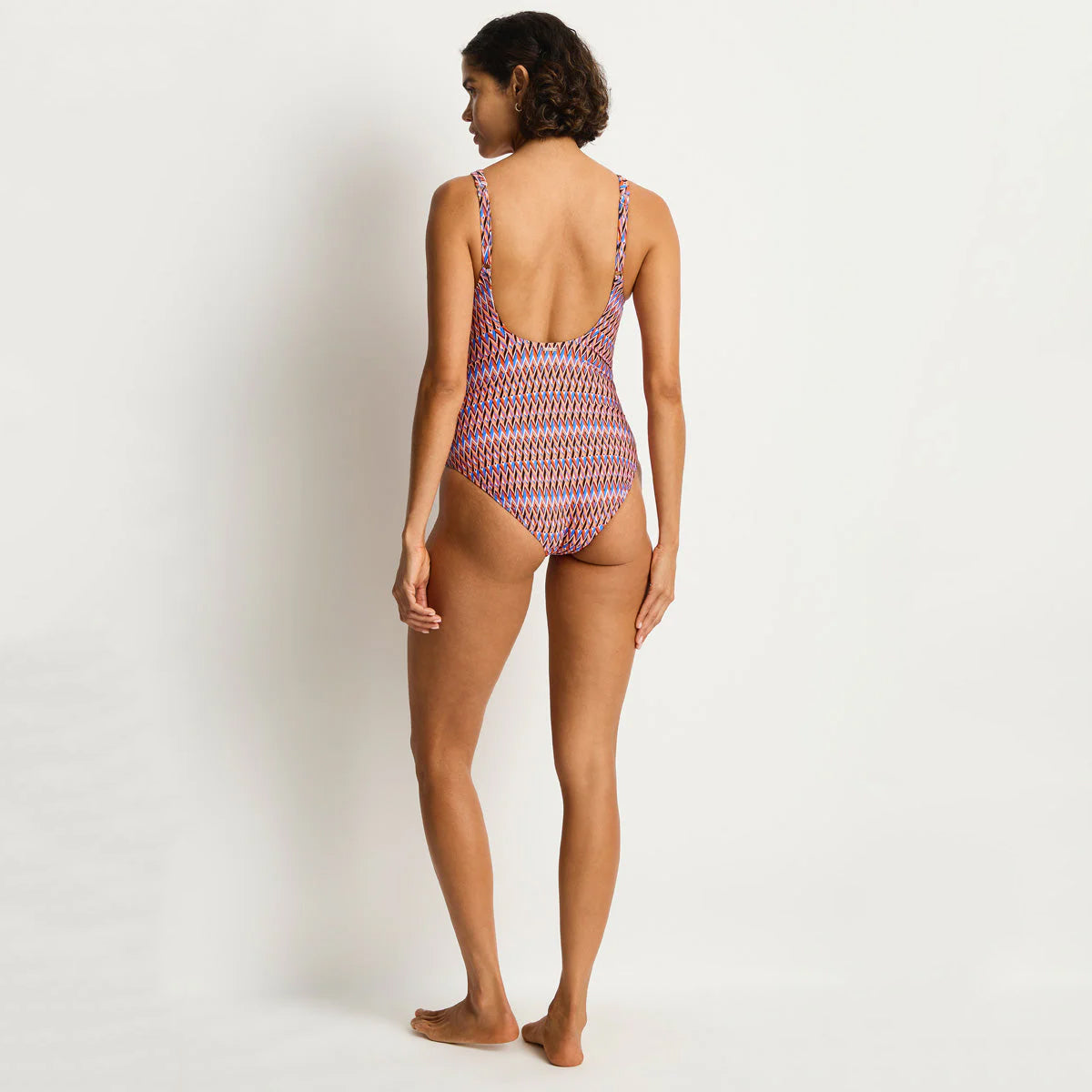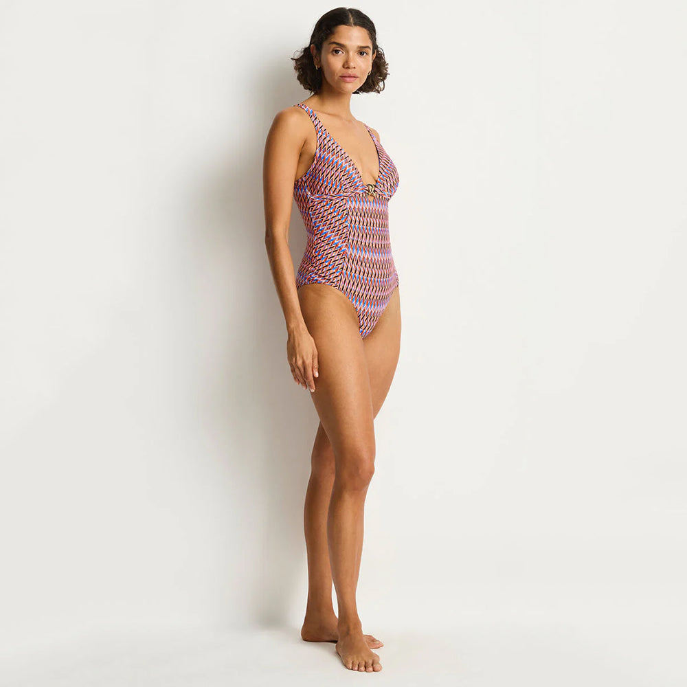 Tessera features a kaleidoscope of vibrant hues - blue, flame and black - interwoven in a geometric print that speaks to both modern elegance and 1970's glamour. Crafted from recycled base-cloths, Tessera is not only a celebration of colour and form, but also a homage to sustainable swimwear and what that might mean for the future.