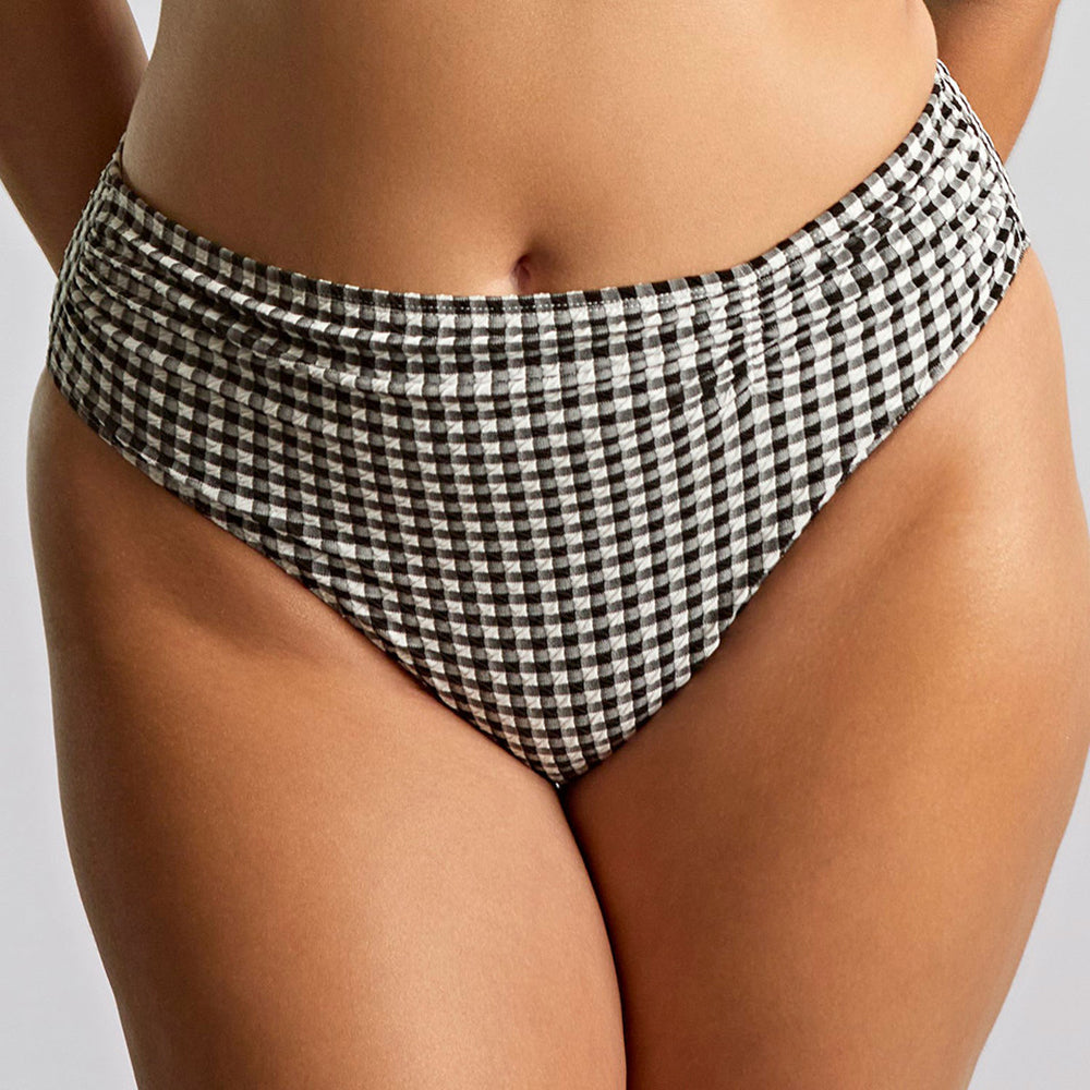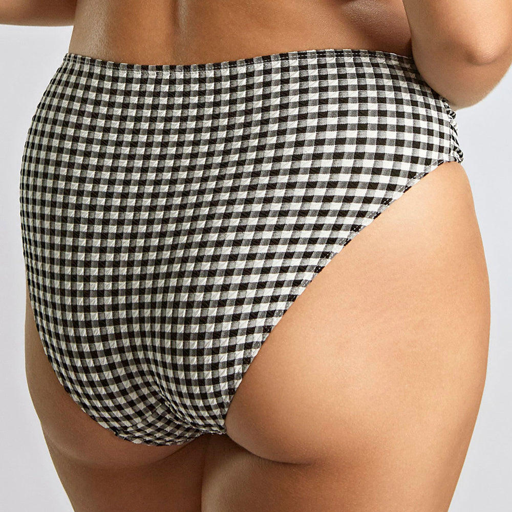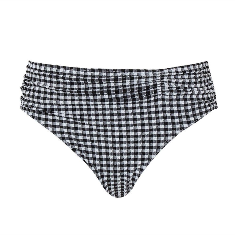 Designed with moderate coverage and strategic gathering at the front, this midi black gingham bikini bottom delivers subtle tummy control without compromising on style. The flattering silhouette skims the midsection while the classic gingham pattern adds visual interest. Perfect for those seeking a confident, comfortable fit that looks as good as it feels.