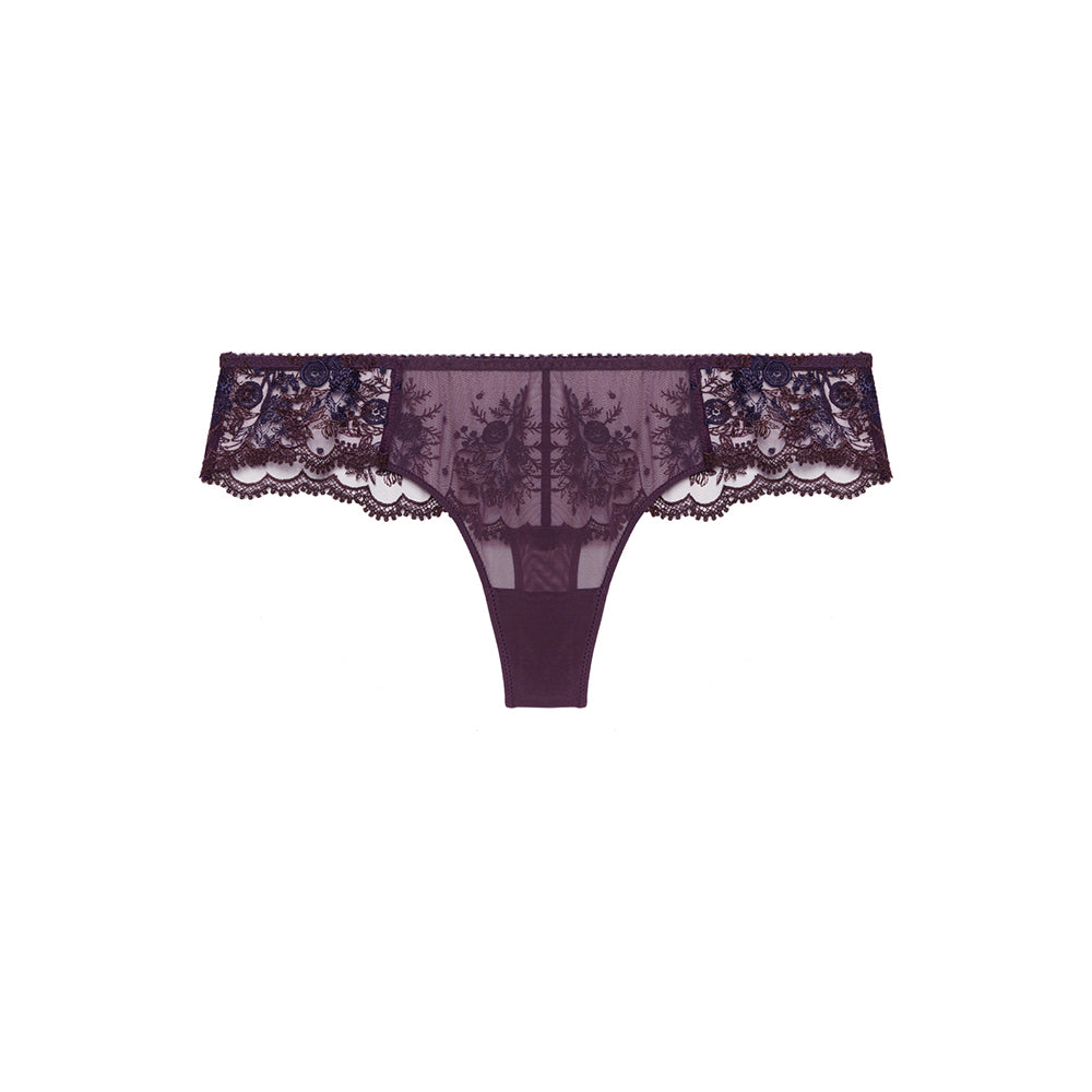 Tanga in recycled embroidery and tulle. Embroidered back with scalloped trim on the curves of the buttocks.