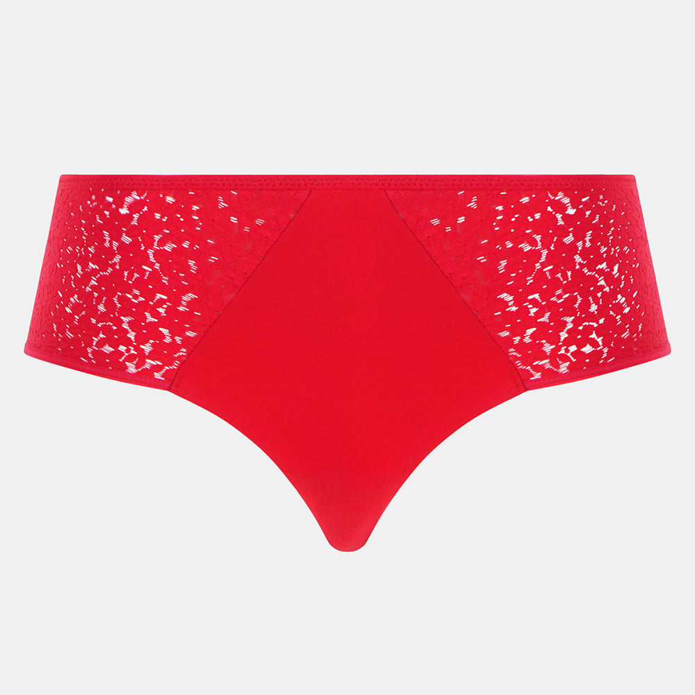 Norah high- waist shorty. Combination of extra soft floral lace and soft feel fabric. Front and sides covered with floral lace. Front lined with fabric for modesty. Lace fabric panel at the back.