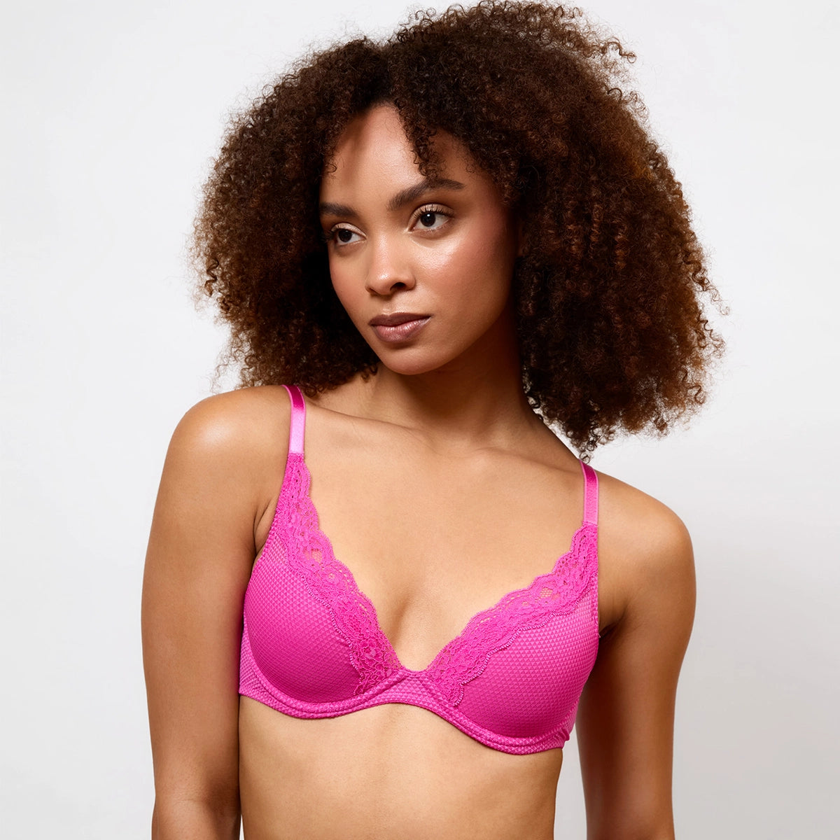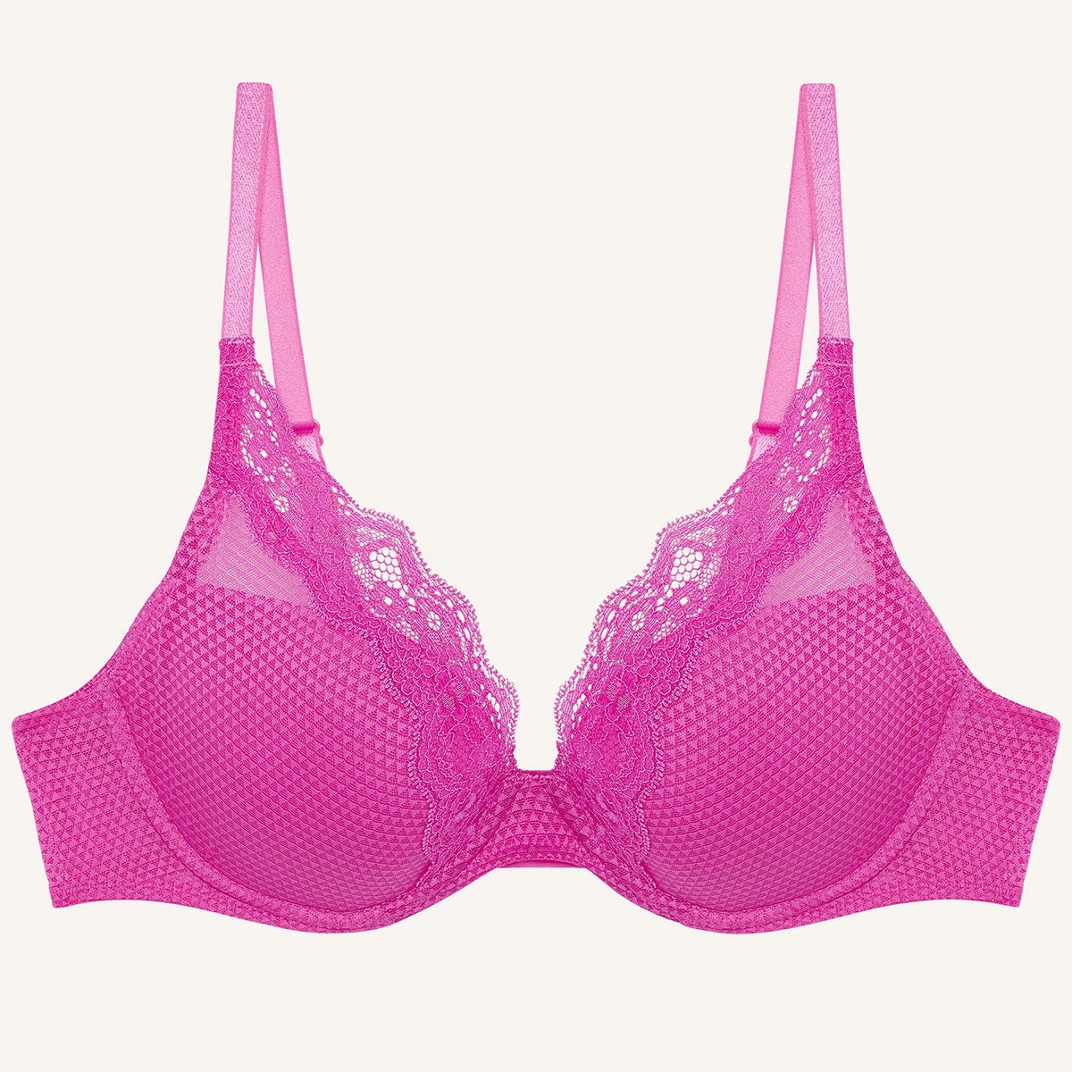 Cups plunge very low in the centre to create a deep V neckline that complements low-cut tops.