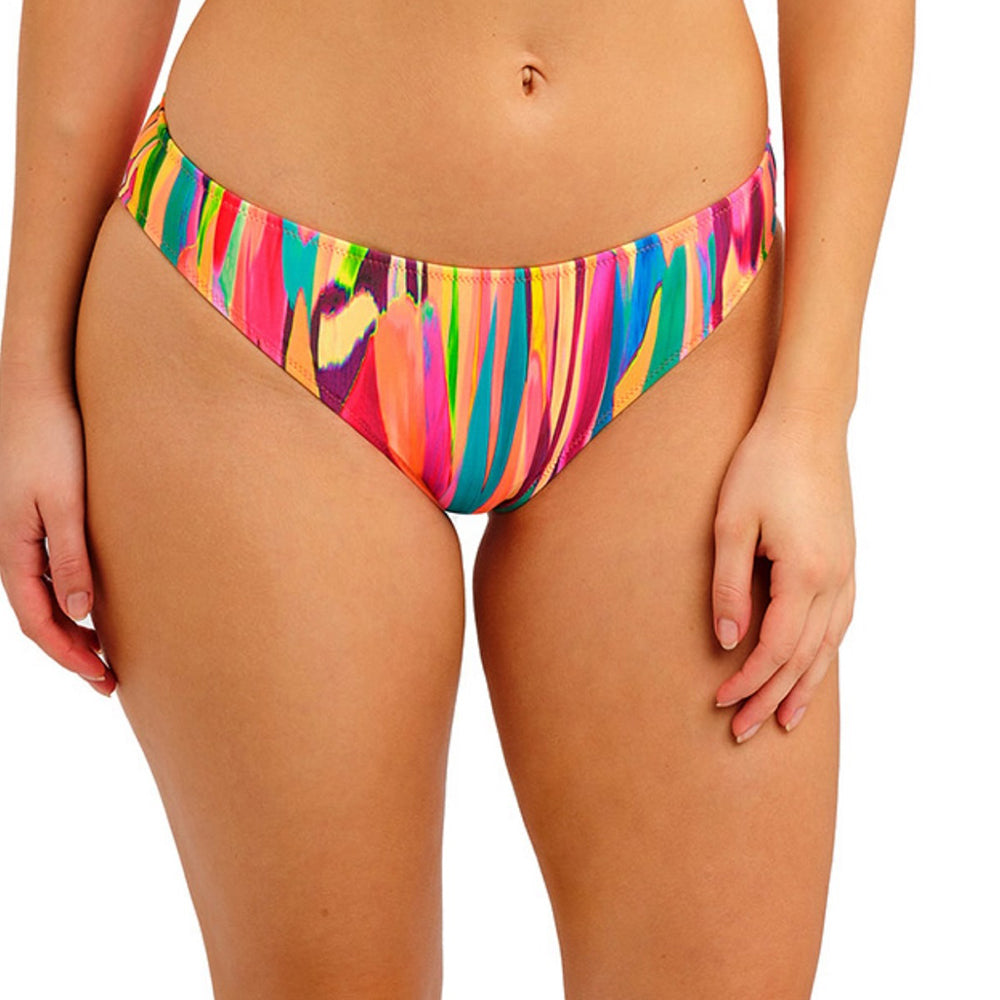 The San Antonio Fiesta Bikini Bottom delivers confident coverage with a hip-sitting silhouette that flatters the leg beautifully. Its generous seat ensures comfort and security, while a vibrant palette of bold oranges, pinks, and yellows punctuated with striking teal and green accents captures the spirited energy of a fiesta. Perfect for those seeking both style and substance in their swimwear.