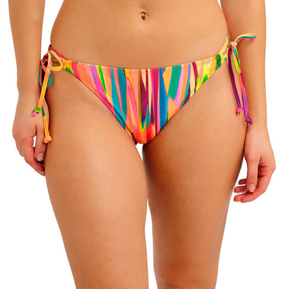The San Antonio Fiesta Tie Side Bikini Bottom delivers contemporary style with a relaxed, hip-hugging silhouette. Featuring narrow, adjustable side ties, this design offers customizable comfort and a flattering fit. Medium coverage provides the perfect balance between coverage and confidence. The vibrant palette—bold oranges, pinks, and yellows punctuated with striking teal and green accents—captures the spirited energy of fiesta culture. Ideal for those seeking a statement piece that combines wearability with eye-catching colour blocking.